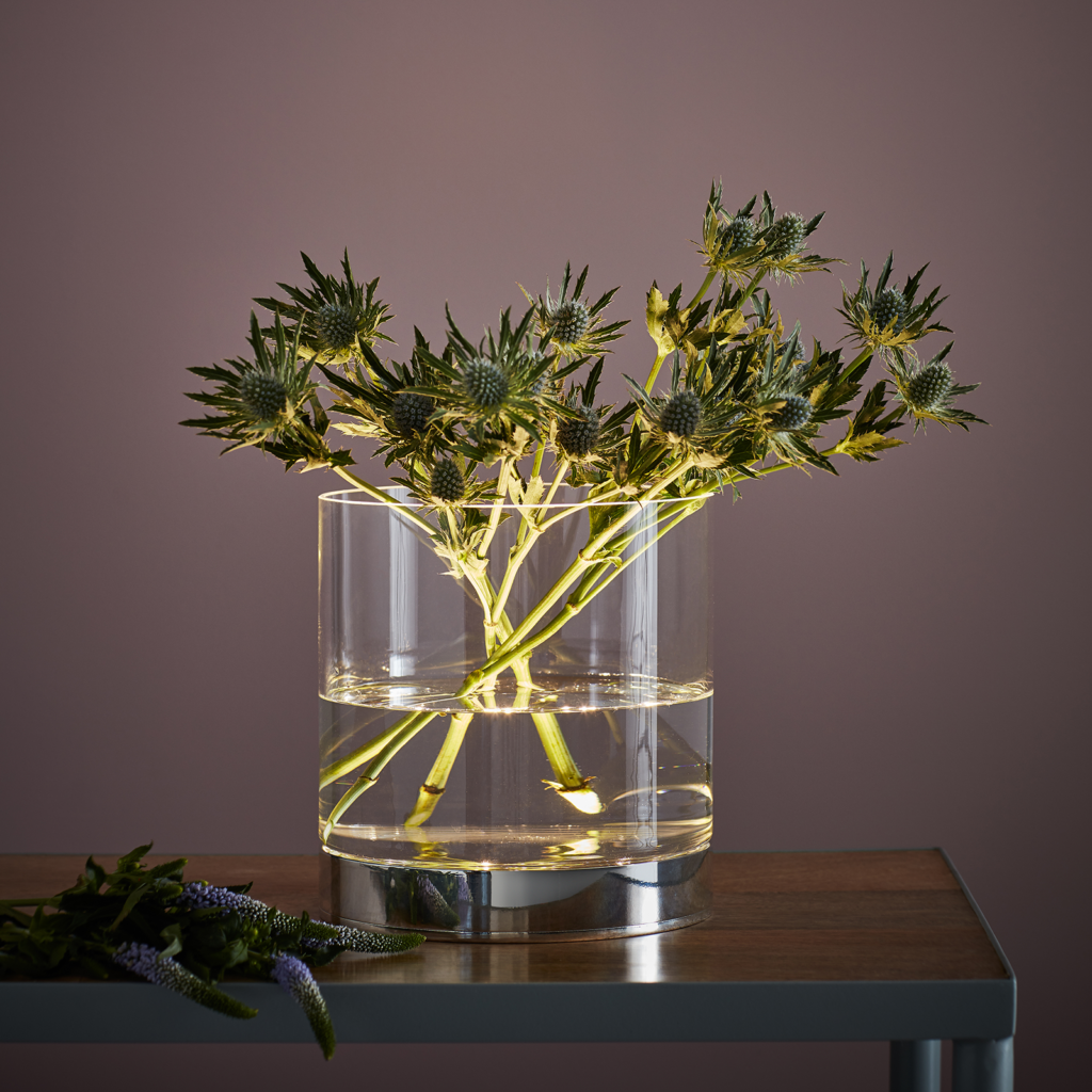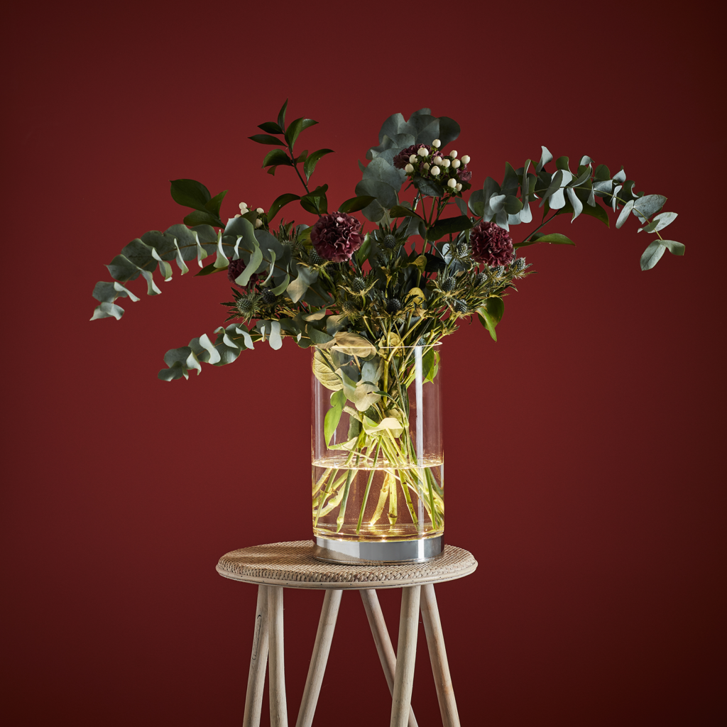 Bouquet bordslampa/-dekoration från Markslöjd. Fast LED som lyser uppåt genom glaset. Glaset har botten och går att ha vatten, blommor eller annan dekoration i. Strömbrytare på lampfoten. Ingår uppladdningsbara batterier som håller i ca 8 timmar efter laddning.